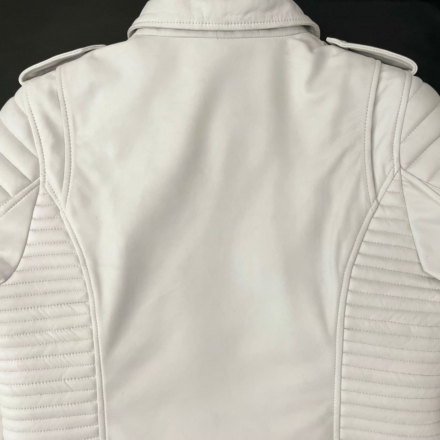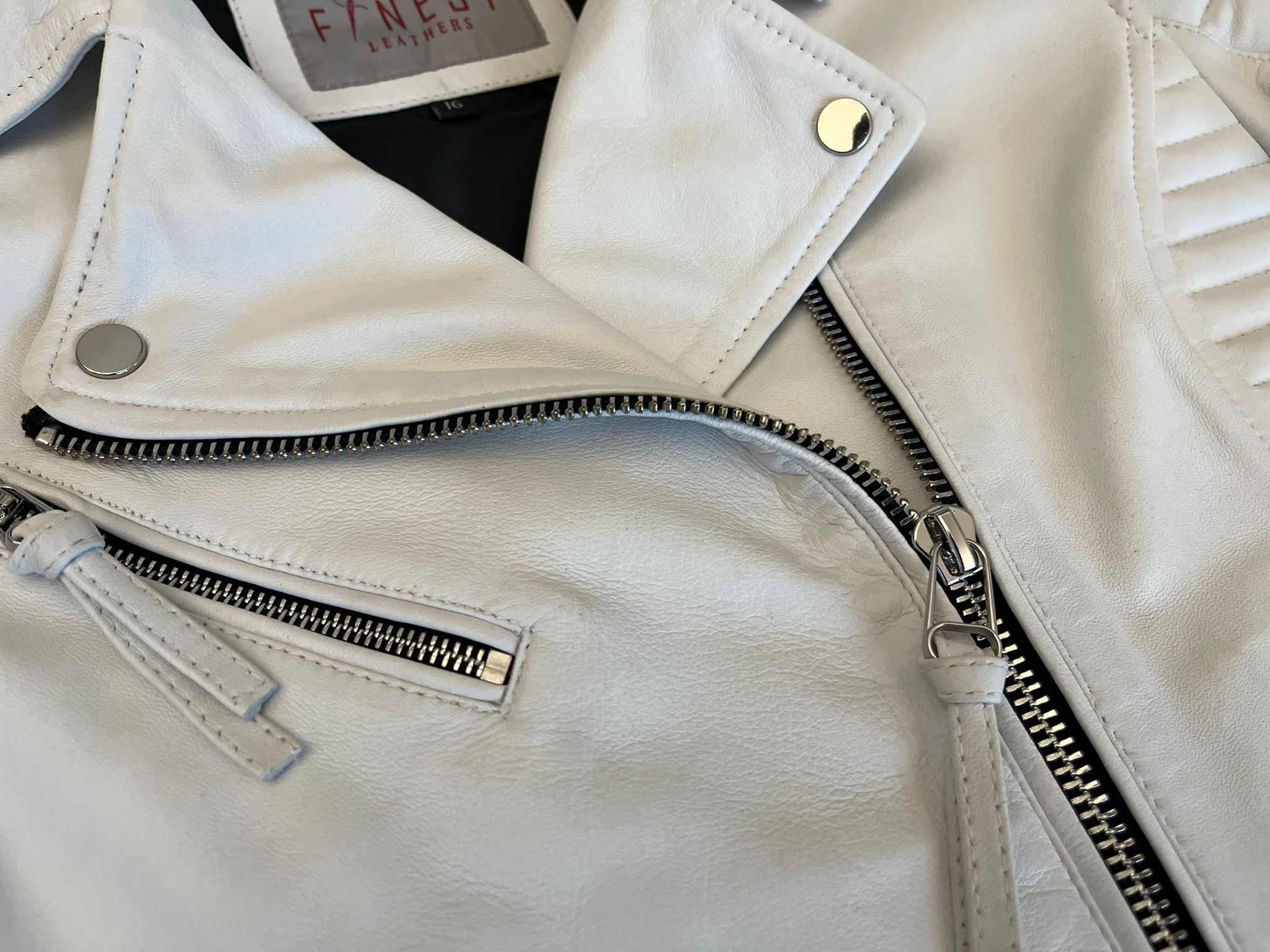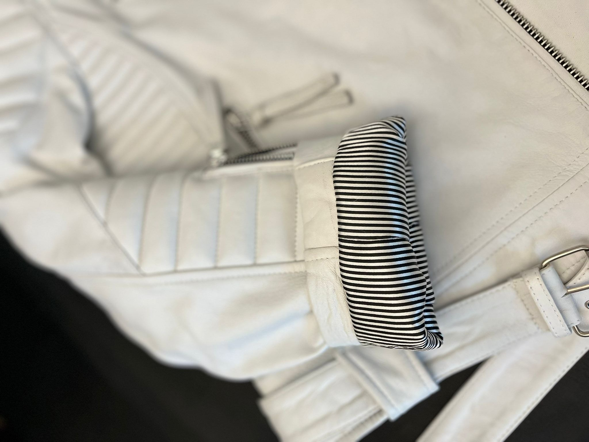 This striking white biker jacket, crafted from 100% genuine sheepskin leather and accented with gleaming chrome hardware, is more than just outerwear—it’s a statement. The quilted detailing along the sleeves and side panels gives it both edge and comfort, while the sleek white hue offers a refreshing take on classic biker style. Whether you're cruising through the city streets or heading out for a night to remember, White Gasoline exudes confidence with every step. Pair it with black jeans and boots for a sleek, monochromatic look, or throw it over a graphic tee for an effortlessly cool, laid-back vibe.