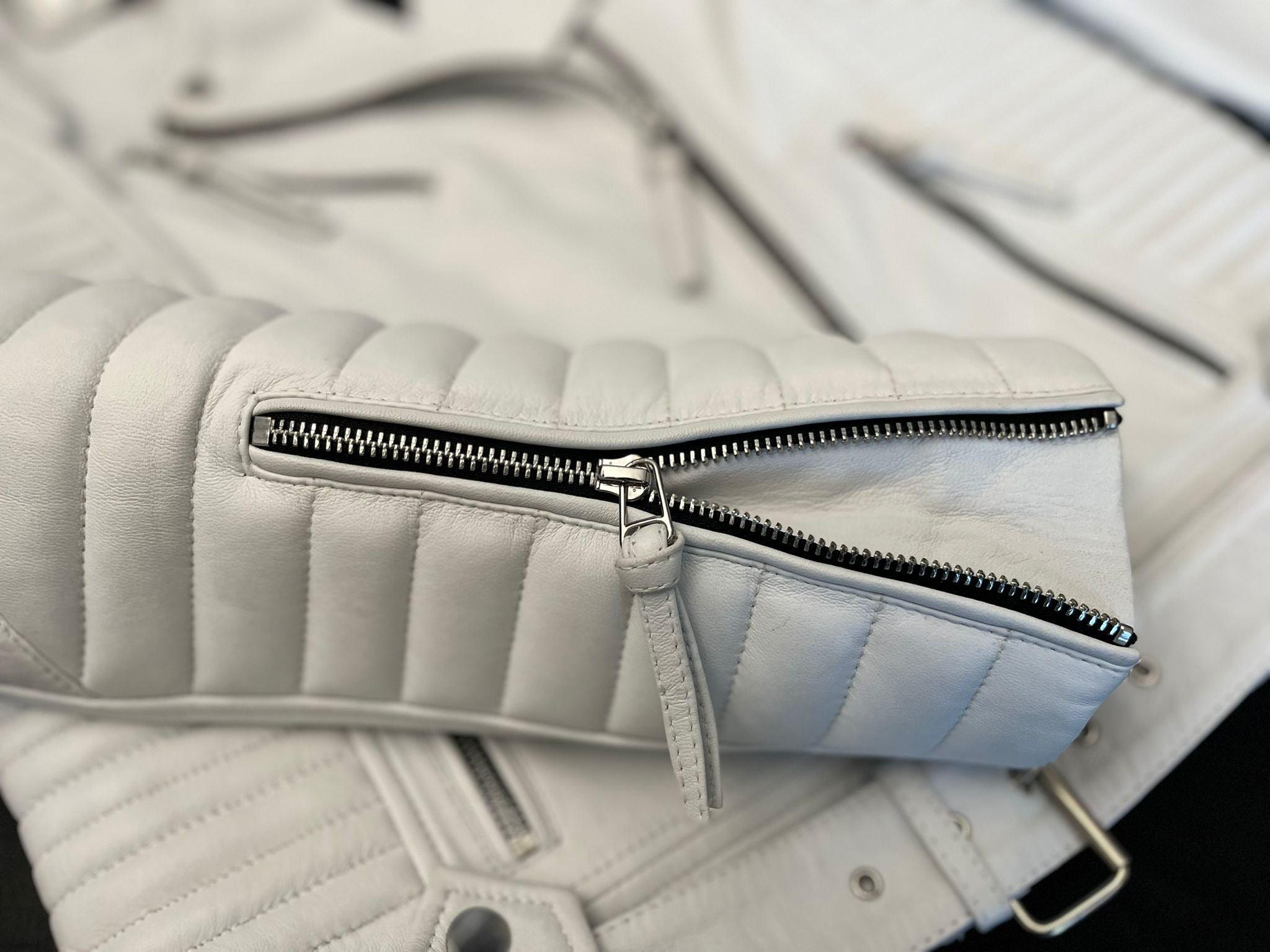 TURN UP THE HEAT WITH WHITE GASOLINE CHROME EDITION, THE LEATHER JACKET THAT EMBODIES DARING STYLE AND UNDENIABLE PRESENCE.